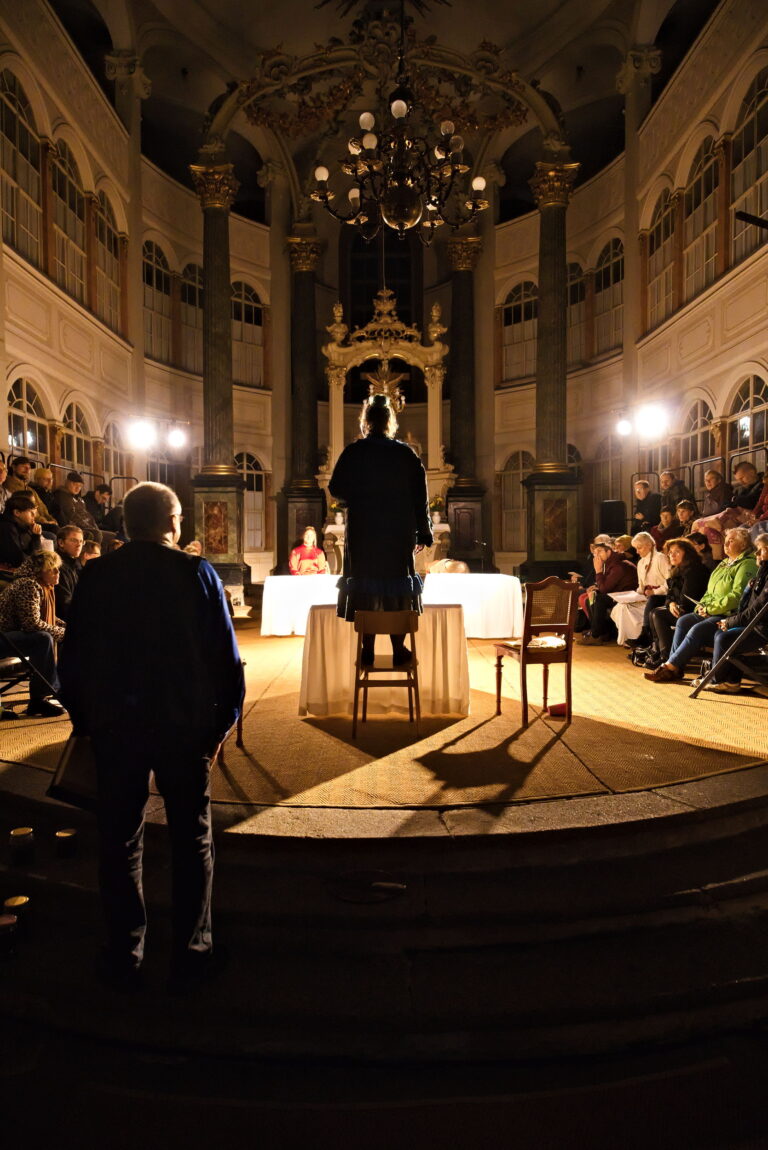Für die Aufführung laden die Darsteller*innen und ein Chor das Publikum ein, im Schwesterhaus Kleinwelka bei Bautzen einem performativen Gastmahl beizuwohnen. Denn ein Tisch ist bekanntlich einer der besten Orte, um miteinander ins Gespräch zu kommen. Hier kann aufgeklärt und behauptet, geschwärmt, gesponnen, gestritten und gezweifelt werden.